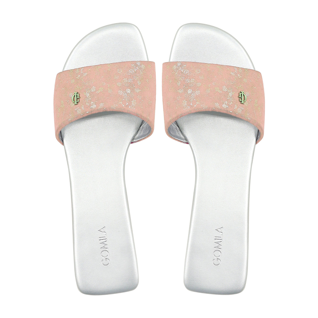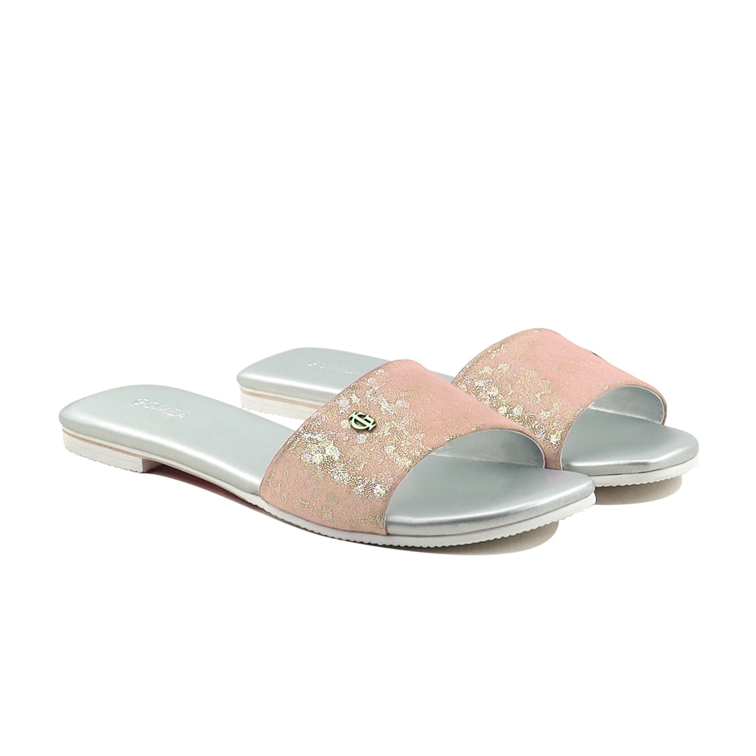 Handcrafted with premium blush pink shimmering suede and a sleek silver base, these slippers effortlessly combine elegance with everyday wearability, making them the perfect choice for any occasion.