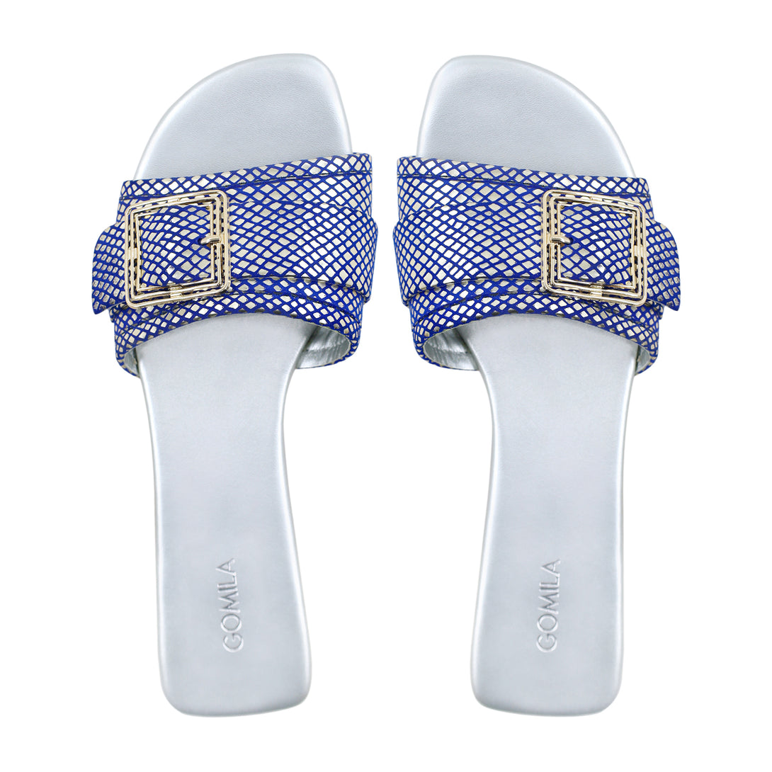 ✅ Effortless Charm: The refined combination of vibrant bllue mesh, a striking gold-tone buckle, and a golden base makes these slippers a bold and stylish addition to your wardrobe.